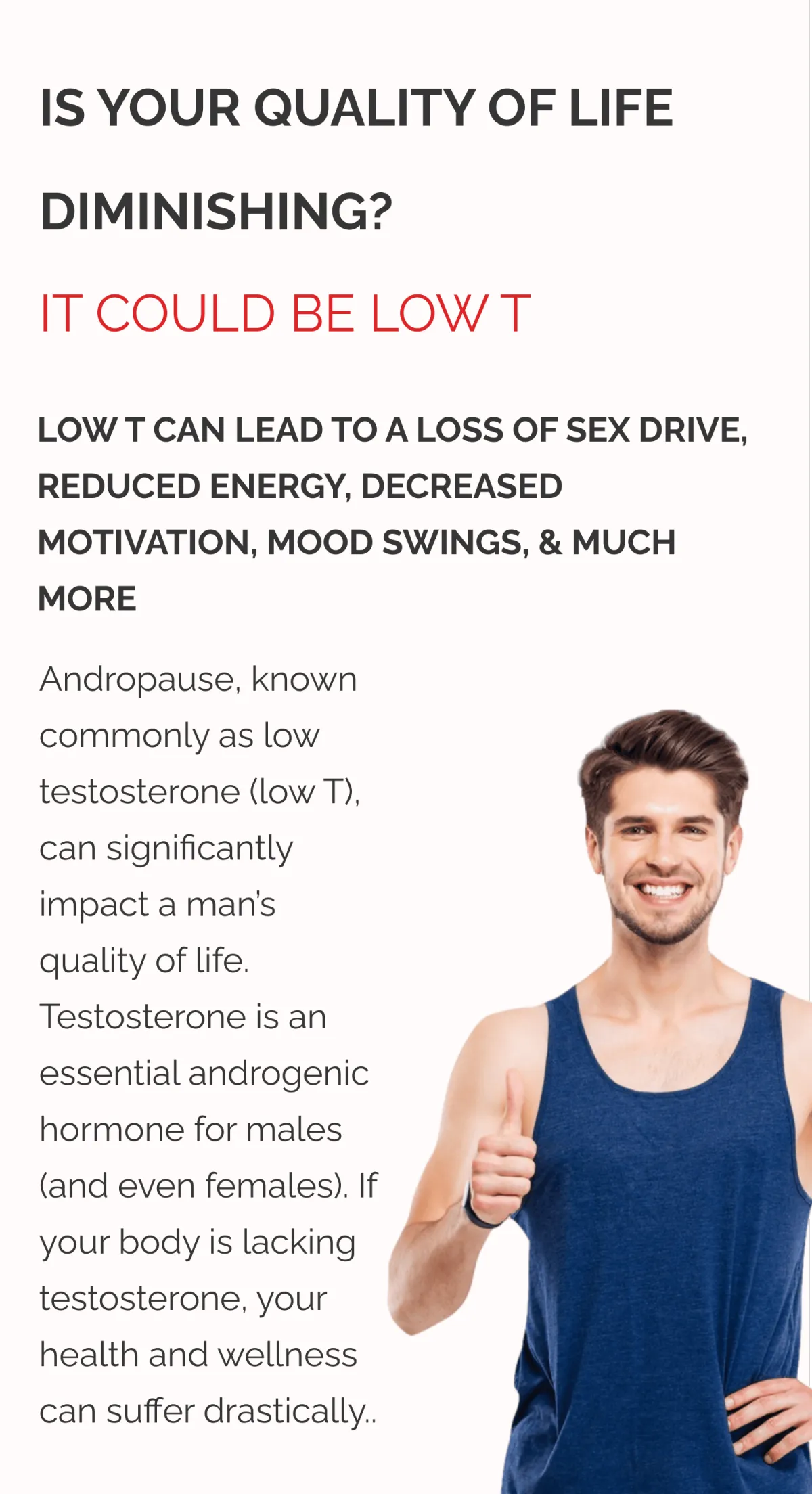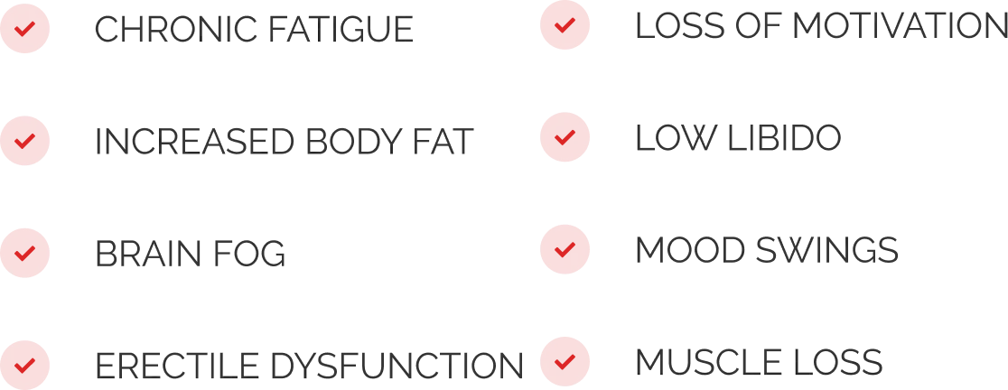 LOW T CAN LEAD TO A LOSS OF SEX DRIVE, REDUCED ENERGY, DECREASED MOTIVATION, MOOD SWINGS, & MUCH MORE
